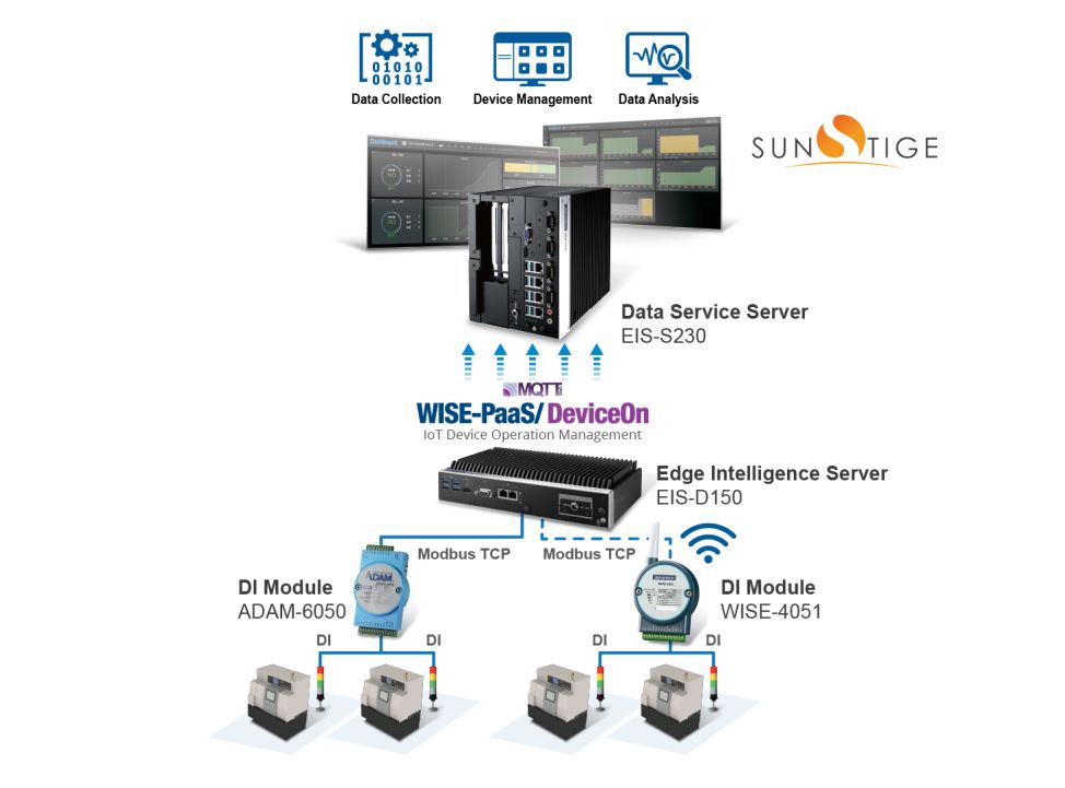 由于EIS-D150各种接口丰富,在本案实际应用中,可连接高达20颗ADAM-6050(数据走以太网络传输)和WISE-4051(以WiFi无线连接)外挂式数据集取模块,整个厂区仅需布建少量边缘智能服务器即可搜集并整合全部机台信息,为客户节省不少布建成本。