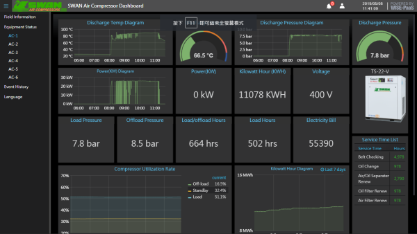 主要监控数据包括空压机的温度、压力、空气、油、油气分离滤清器及传动皮带,轴承…等等空压机关键零组件的健康状况,在故障发生之前就可以主动通知保修人员进行耗材更换。