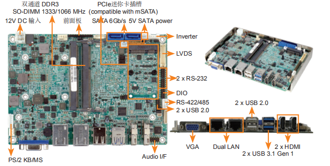 ● 支持三个 COM, 四个 USB 3.0, 两个 SATA 6Gb/s 和音频